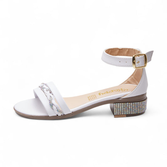 Sandalias de tacón grueso 3 cm para dama en textil tipo piel color blanco, punta abierta con tiras y brillantes decorativos, hebilla ajustable en tobillo dv2925