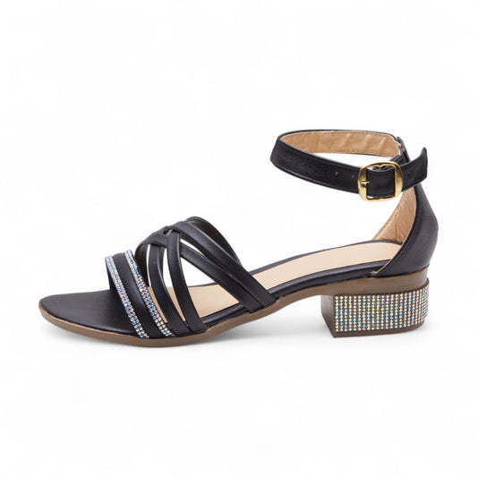 Sandalias de tacón grueso 3 cm para dama en textil tipo piel color negro, punta abierta con tiras y brillantes decorativos, hebilla ajustable en tobillo dv2925