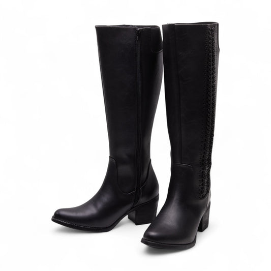 Botas largas para dama color negro tipo piel con tacón grueso de 7 cm, punta en pico y trenzado decorativo lateral dv2925