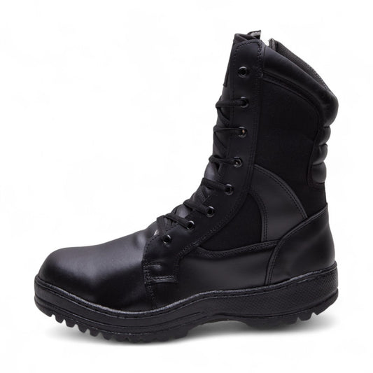 Botas tipo militar para caballero en material tipo piel color negro con agujetas funcionales, punta cuadrada, suela antiderrapante y mezcla de texturas dv2925