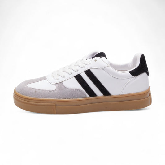 Tenis casuales para dama en mezcla textil tipo piel y aterciopelado con líneas laterales en contraste y agujetas funcionales color blanco dv2925