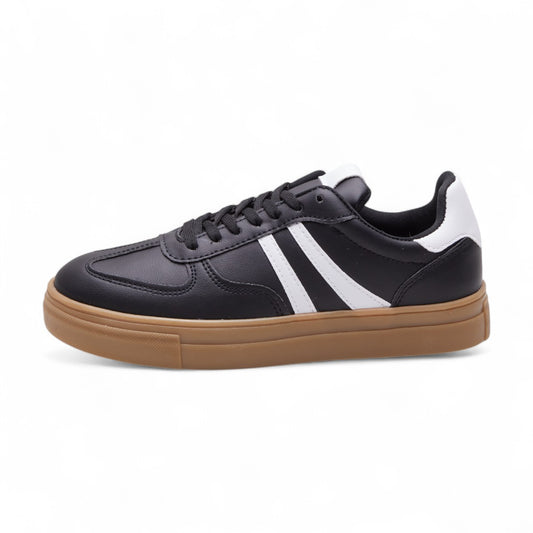 Tenis casuales para dama en mezcla textil tipo piel y aterciopelado con líneas laterales en contraste y agujetas funcionales color negro dv2925
