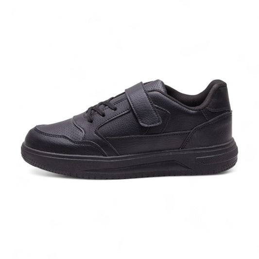 Tenis deportivos para dama en material tipo piel con agujetas funcionales, tira ajustable, textura transpirable y suela confort color negro dv2925
