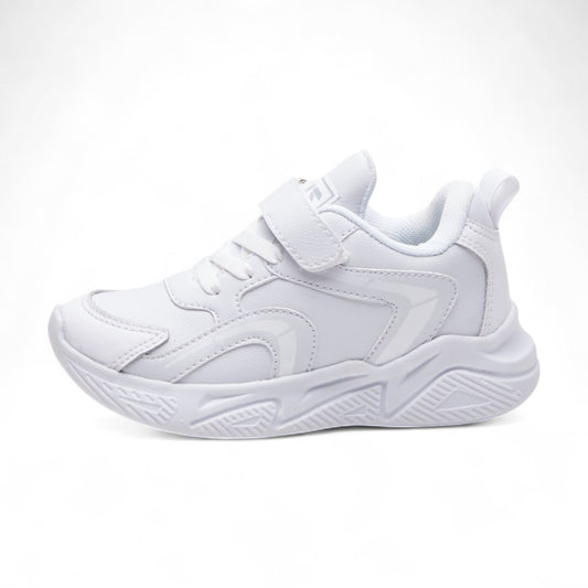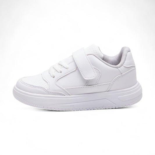 Tenis deportivos para niño color blanco en material tipo piel con agujetas y correa ajustable, punta redonda y diseño transpirable dv2925