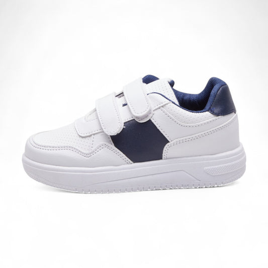 Tenis deportivos para niño color blanco con detalles azul marino en material tipo piel, punta redonda, tiras de ajuste y suela confort transpirable dv2925