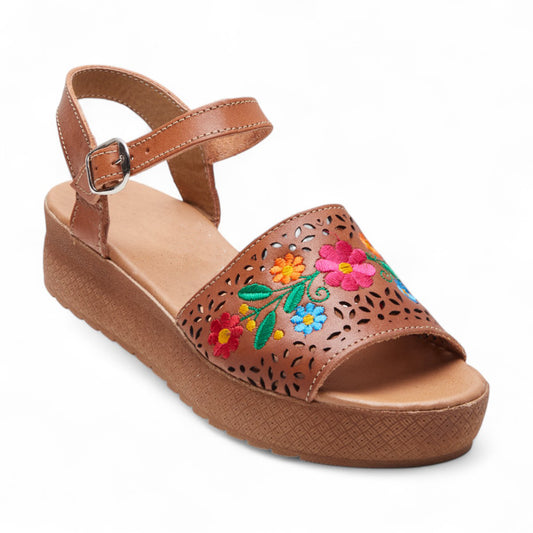Sandalias de plataforma 5cm para dama en piel color café con bordado floral y cortes decorativos a láser dv2925