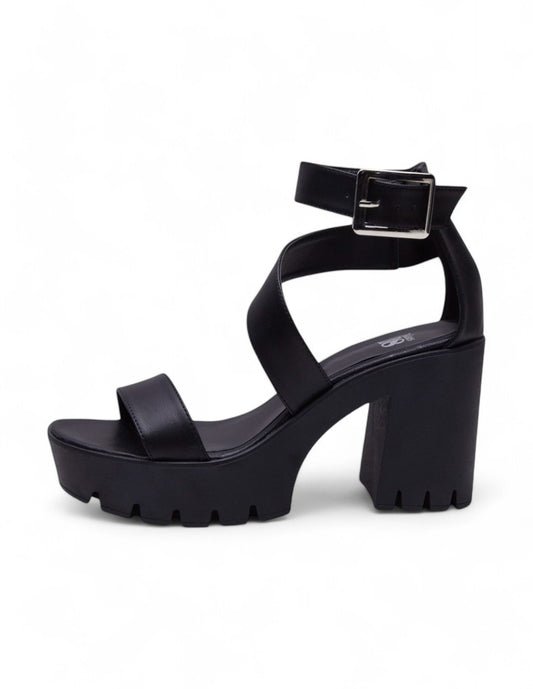 Tacones formales para dama con plataforma y tacón grueso de 10cm, sandalias elegantes en material tipo piel, punta y talón abiertos con correa y hebilla ajustable en tobillo color negro dv2925