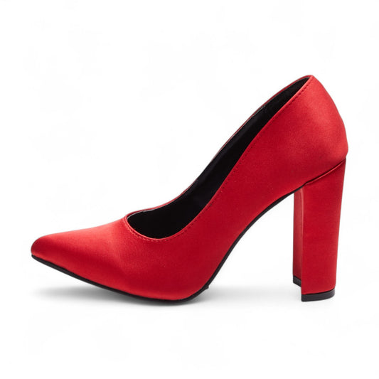 Tacones formales para dama con punta en pico, tacón grueso de 10 cm en textil brillante, de metedera, punta y talón cerrado color rojo dv2925