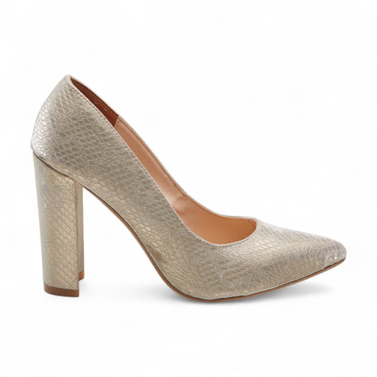 Tacones formales para dama con punta en pico, tacón grueso de 10 cm en textil brillante, de metedera, punta y talón cerrado color dorado dv2925